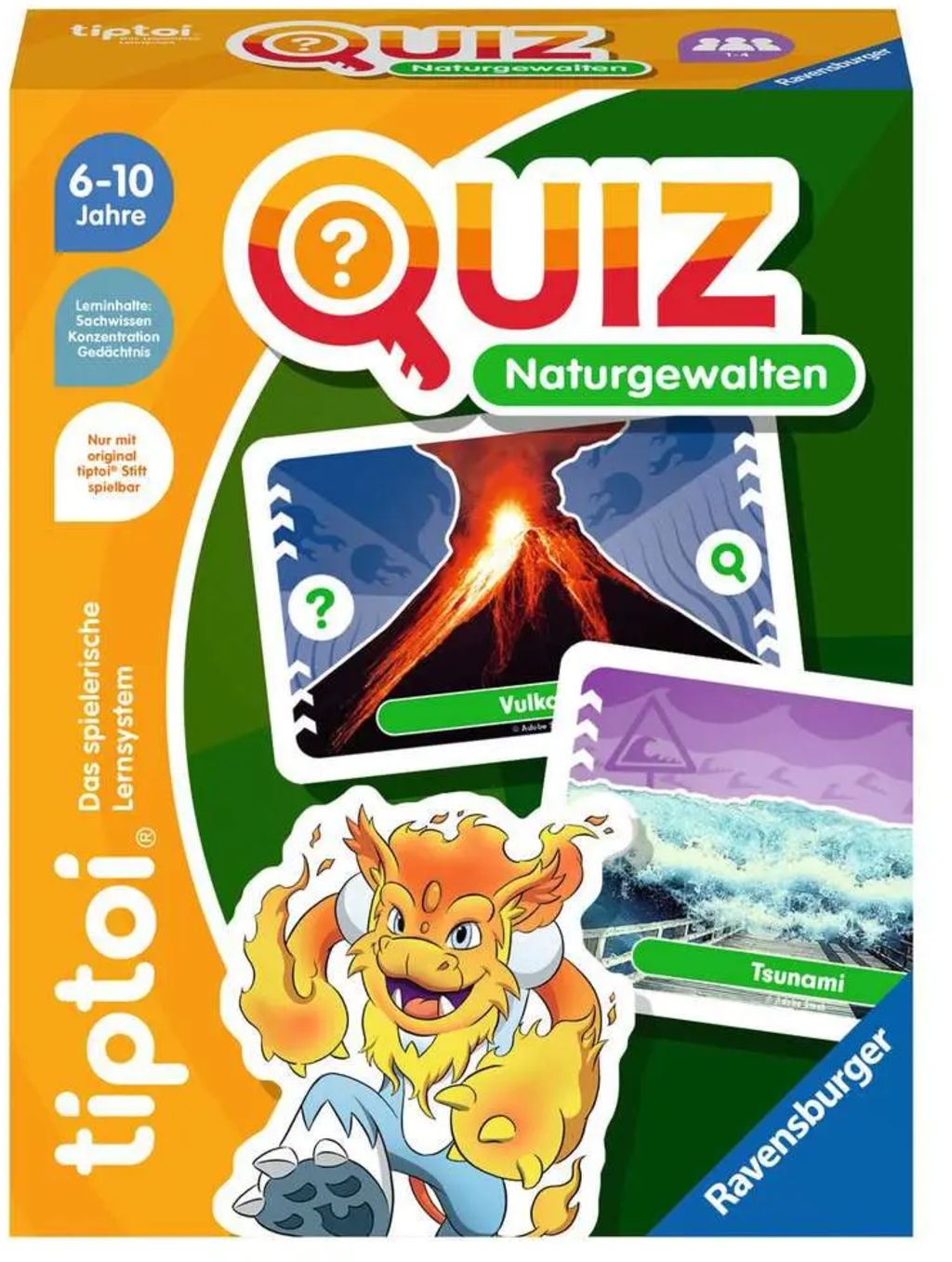 Interaktivt lärande spel: Genom att trycka på spelkorten med tiptoi-pennan hör du autentiska ljud (som rasande stormar och bubblande vulkaner), frågor och svar om naturfenomen.