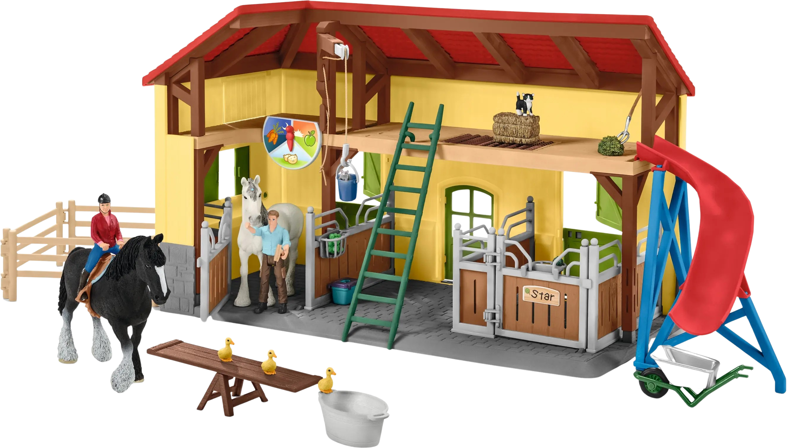 Det färgglada Schleich® häststallet tar bondgårdsäventyret direkt in i barnrummet! Med 7 djur, bonden Paul, bonden Laura, 2 hästboxar och massor av tillbehör kan barn återskapa det dagliga bondgårdslivet. Från att mata djuren och lägga höbalar till små upptäckter som musen i hålet – otaliga berättelser och lekidéer väntar.