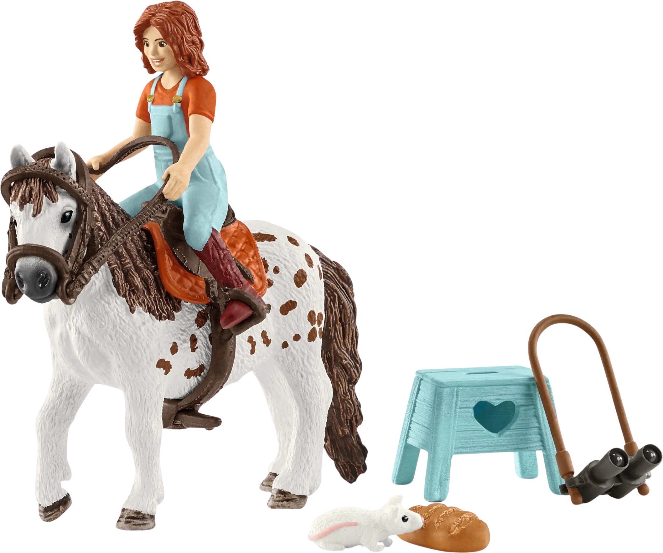 Mia och hennes söta shetlandsponnysto Spotty är redo för många äventyr! Med sadel, träns, kikare och små tillbehör kan barn återskapa hästlivet och hitta på sina egna berättelser. De detaljerade figurerna uppmuntrar till kreativ lek och låter små hästfantaster fördjupa sig i Horse Clubs värld – perfekt för timmar av skoj!