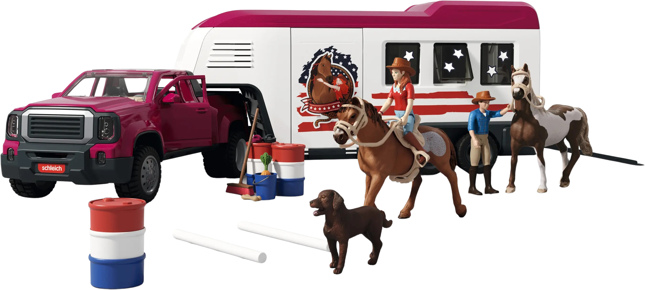 Med Lakeside-lastbilen och släpet är Hannah och Mr. Kramer perfekt utrustade för sitt westernäventyr. De två hästarna färdas säkert i den rymliga släpet, medan taket kan användas som ett praktiskt skydd. Tack vare de många kärleksfullt utformade detaljerna som sadlar, hage och träningsutrustning garanterar detta set autentisk lekstund och oändliga äventyr på hästklubben.