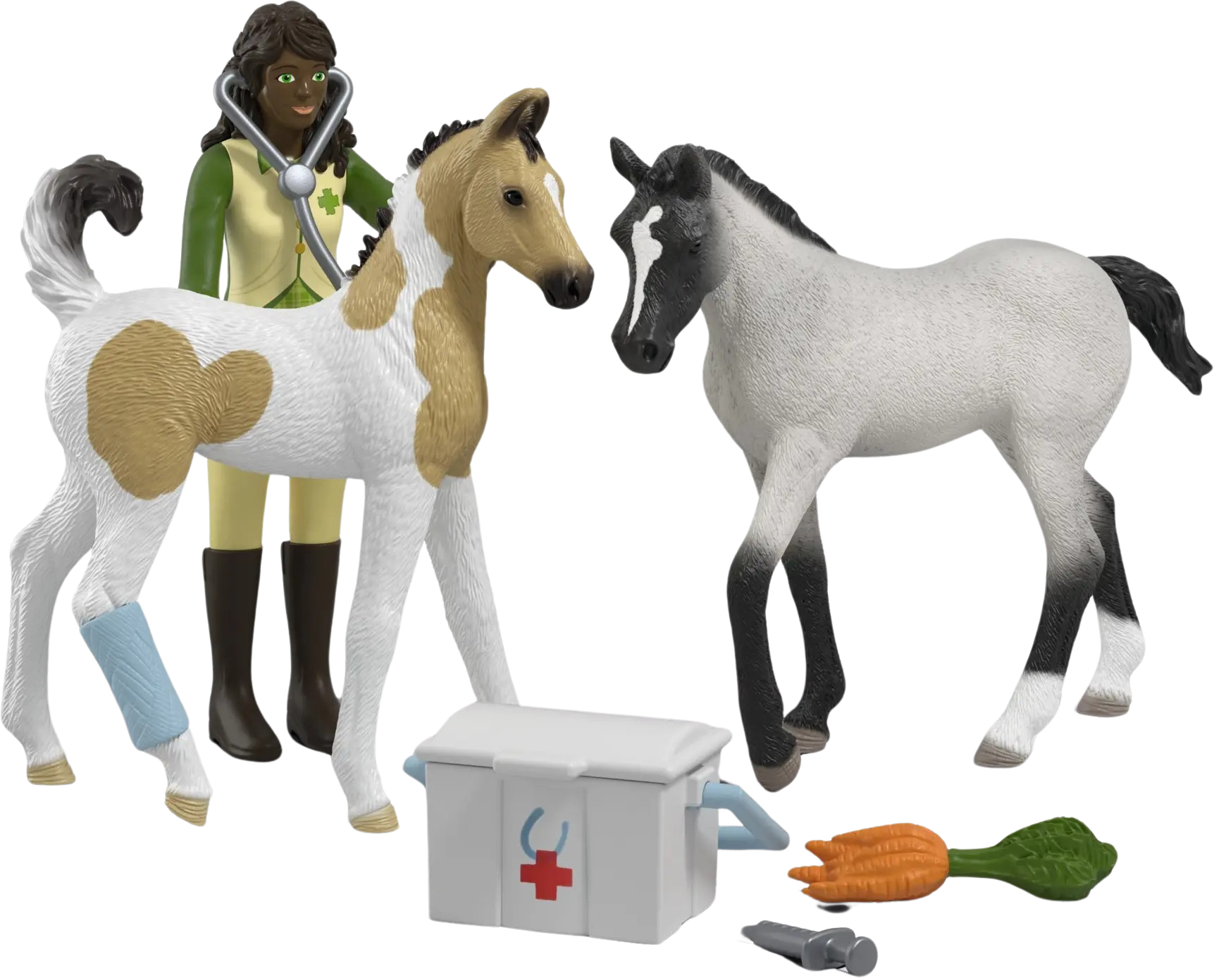Med Sarahs första hjälpen-kit från schleich® HORSE CLUB kan barn uppleva på nära håll hur Sarah lever ut sin passion för att ta hand om djur. Hon undersöker noggrant sina två föl – Marwari-fölet Leela och Quarter Horse-fölet Blue – och behandlar mindre skador med spruta, stetoskop och plåster. Som belöning för modigt deltagande får barnen en god morot. Detta set främjar lekfullt ansvarskänsla och empati, vilket väcker djurskötselns värld till liv för unga hästälskare.