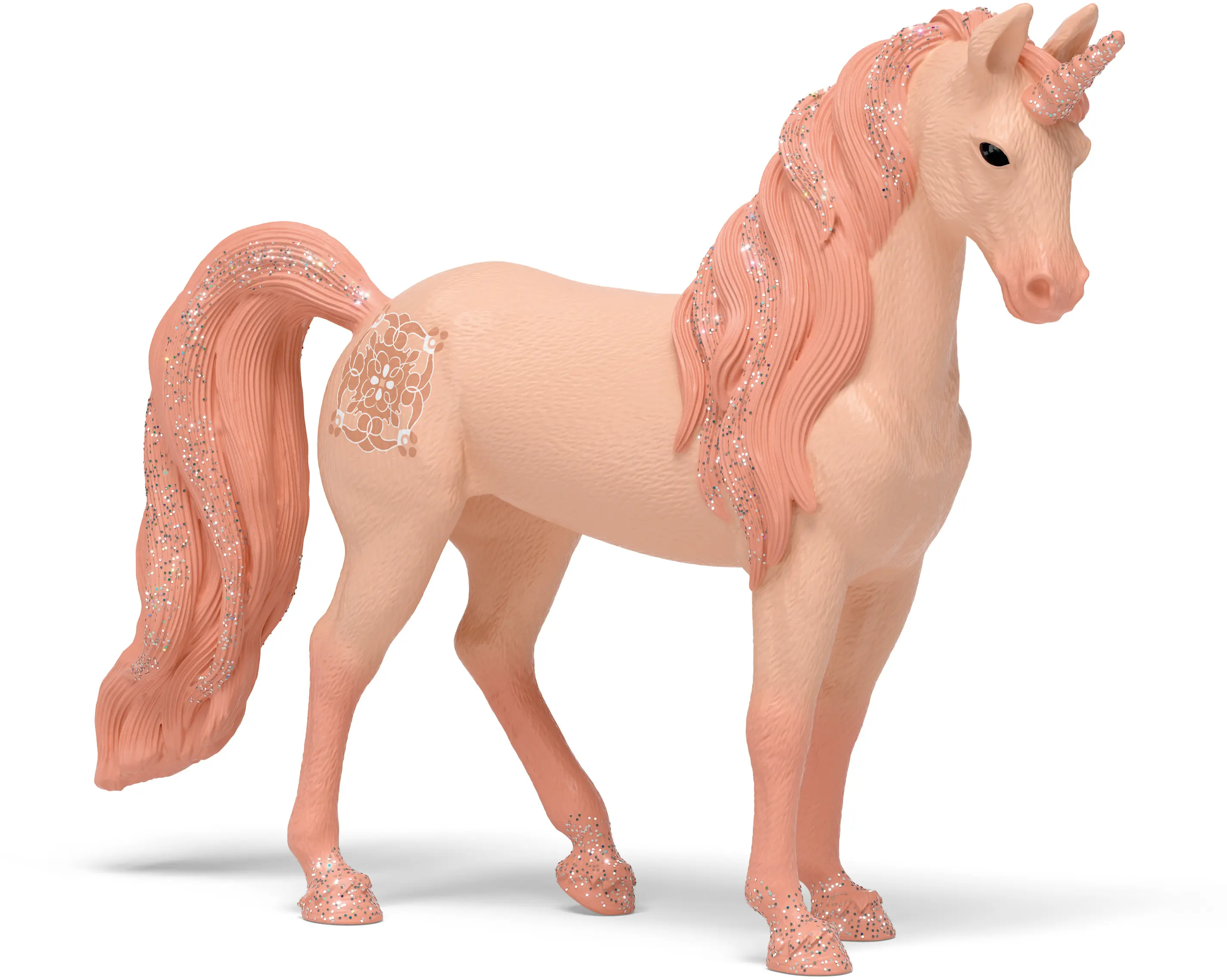 Enhörningsstoet Peach strålar med sin delikata persikofärgade nyans, glittrande horn och glittrande strumpor. På flanken bär hon en filigran-tatuering som berättar om legenderna från den mystiska persikoträdgården. Charmig och mystisk, Peach bjuder in dig till magiska äventyr och samlande.