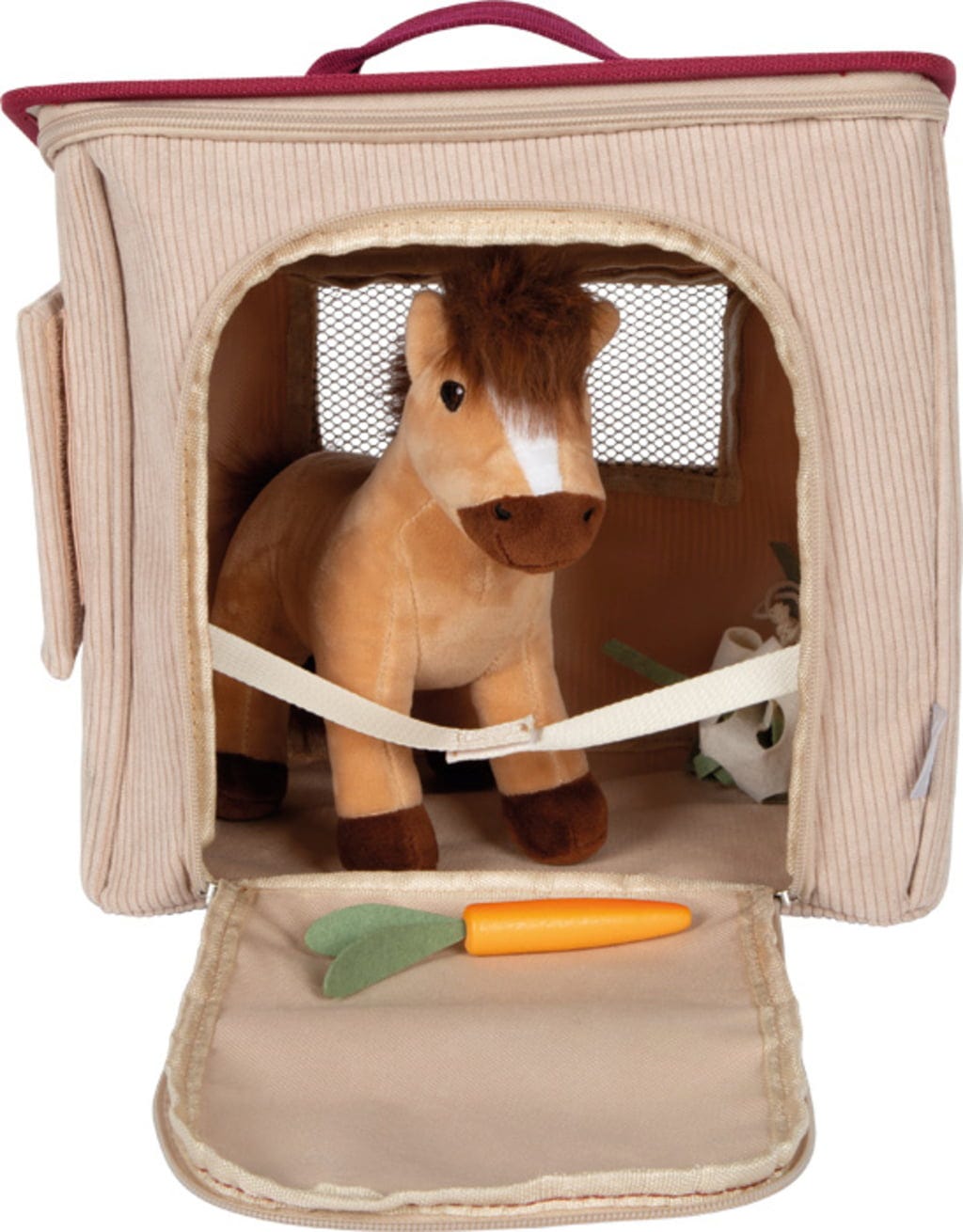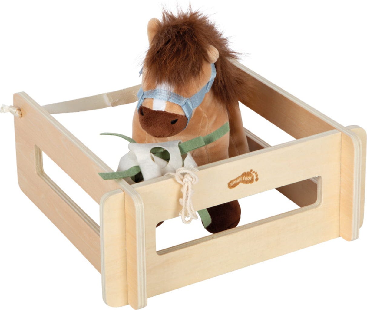 Innehåller tillbehör: plyschhäst, sadel, träns, schabrak, morot, hönät, gödselskopa, sopskyffel, hästspillning i trä