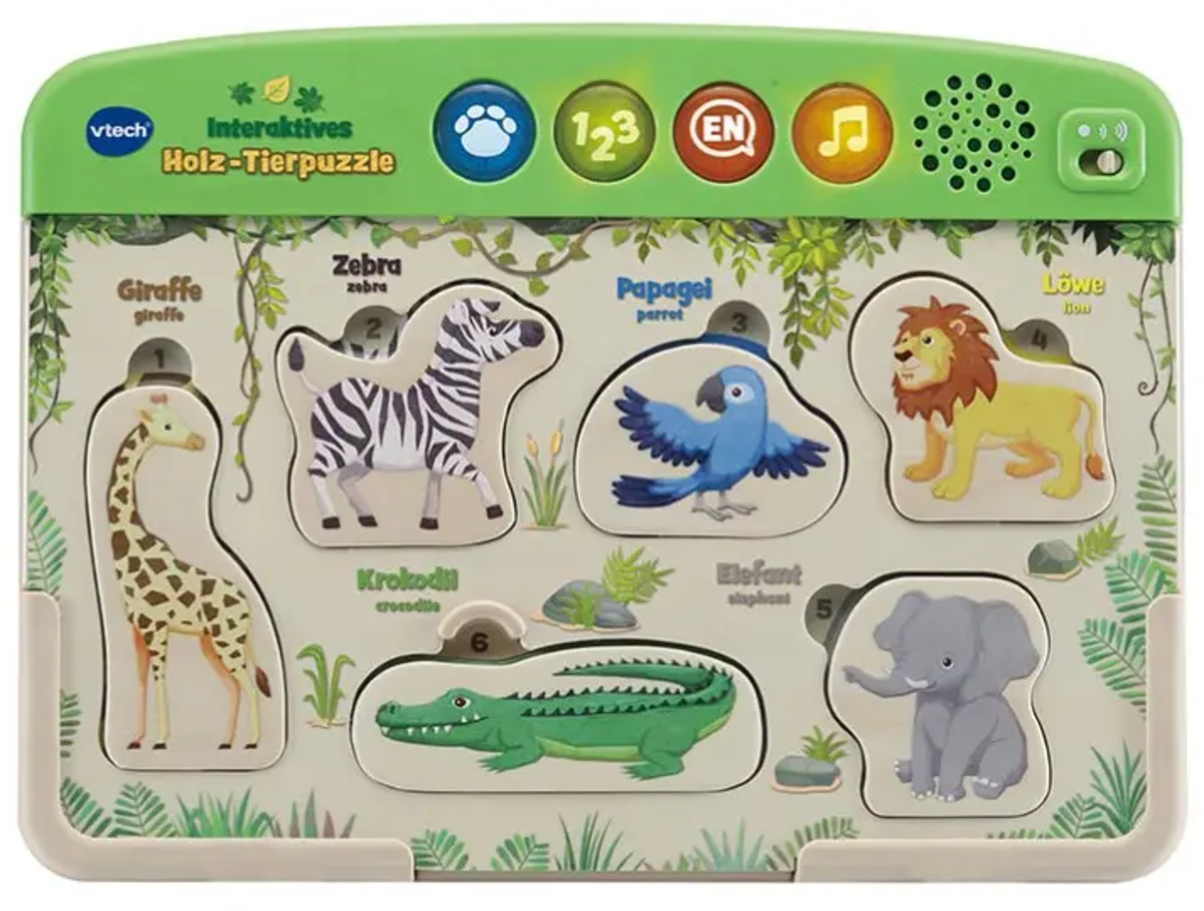 Med det interaktiva djurpusslet i trä kan små djurälskare utforska djurens värld och deras livsmiljöer. Finmotorik, logik och de första engelska orden uppmuntras lekfullt – ett roligt lärande för nyfikna upptäcktsresande.