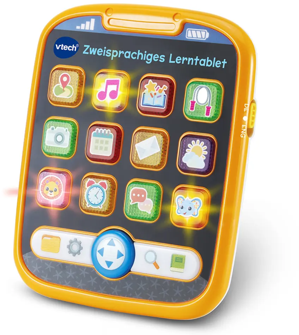 VTech Babys tvåspråkiga lärplatta erbjuder små upptäcktsresande möjligheten att lekfullt lära sig sina första ord på tyska och engelska. De interaktiva knapparna, motiverande fraserna och rollspelsfunktionerna främjar kreativitet, hand-öga-koordination och tidig språkförståelse.