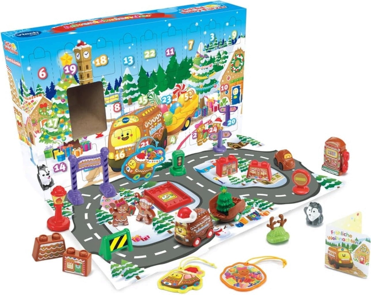 Med Tut Tut Baby Flitzer-adventskalendern blir adventstiden en alldeles speciell upplevelse! Bakom var och en av de 24 luckorna finns kärleksfullt utformade överraskningar från Tut Tut Baby Flitzers glada värld. Kalenderns höjdpunkt är den exklusiva pepparkaksbussen, som känner igen Tut Tut Baby Flitzer med sin magiska sensor och säkerställer interaktiv lek. Det finns också många figurer, hängen och tillbehör som perfekt kan kombineras med befintliga Tut Tut Baby Flitzer-set. Tre sjungsånger och sex glada melodier som väcker den lilla pepparkaksbussen till liv ger ännu mer julstämning. Tack vare det barnsäkra batterifacket, den automatiska avstängningen och de medföljande demobatterierna kan det roliga börja direkt.