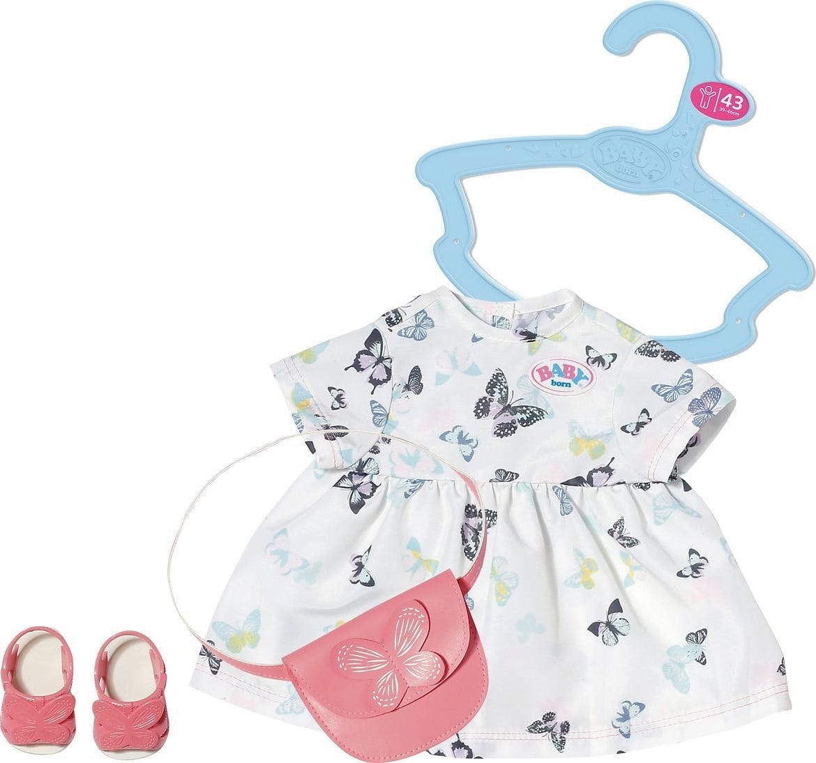 Med detta kärleksfullt designade klänningsset är din BABY born redo för ett speciellt framträdande. Den fina outfiten med matchande väska och skor ger ännu mer lek och kreativa stylingögonblick. Perfekt för små dockföräldrar från 3 år och uppåt – ett sött set att bli förälskad i.